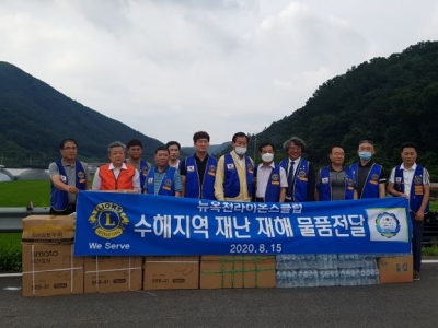 뉴옥천라이온스는 15일 군서 은행리 일원에서 인삼농가 수해복구 활동을 하는 자원봉사자들에게 힘을 되고자 장화, 우의, 고무장갑 각 50개와 생수 200병을 지원했다.