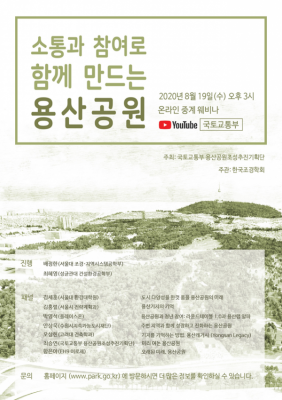 국토교통부는 국민이 참여해 만들어가는 용산공원 논의를 위해 8월 19일 오후 3시 ‘소통과 참여로 함께 만드는 용산공원’을 주제로 국내 석학·전문가들이 참여하는 세미나를 개최한다고 밝혔다.