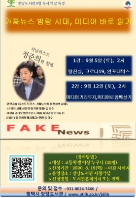 [충청뉴스큐] 평택시 장당도서관은 오는 9월 독서의 달을 맞아 저널리스트 정준희와 함께 ‘가짜뉴스 범람시대, 미디어 바로 읽기’를 주제로 다변화된 미디어와 함께 건강하게 살아가는 방법에 대한 강연을 2회에 걸쳐 진행한다.