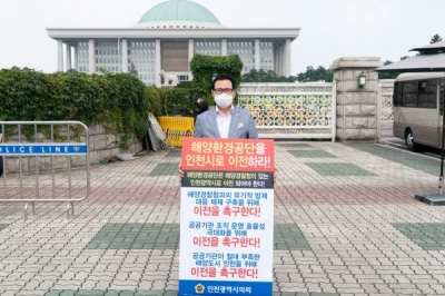 [충청뉴스큐]인천광역시의회 이용범 의원이 18일 국회에서 해양환경공단의 인천시 이전을 건의하며 1인 시위에 나섰다.
