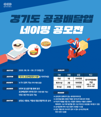 [충청뉴스큐] 경기도주식회사가 도민의 생활 편의 증진 및 소상공인의 권익 보호를 위해 추진하는 ‘공공배달앱 구축사업’ 서비스의 이름을 공모한다.