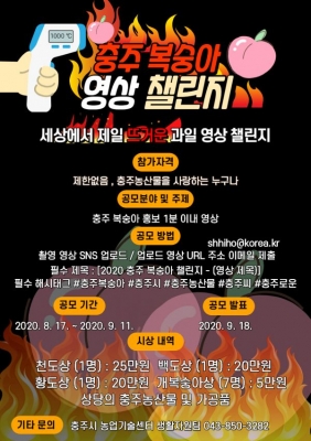 [충청뉴스큐] 충주시농업기술센터는 오는 9월 11일까지 ‘충주복숭아 홍보 영상 챌린지’를 공모한다고 밝혔다.