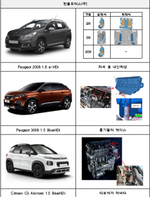 또한, Peugeot 3008 1.5 BlueHDi 등 10개 차종 3,783대는 흡기필터 케이스와 냉각수 호스와의 간섭으로 호스가 손상되어 엔진이 과열될 가능성, Citroen C3 Aircross 1.5 BlueHDi 등 7개 차종 257대는 터보차저 커넥터와 냉각수 호스와의 간섭으로 터보차저 커넥터 또는 냉각수 호스가 손상되어 터보차저가 작동되지 않거나 냉각수 누수로 인한 엔진 과열 가능성, DS3 Crossback 1.5 BlueHDi 46대는 냉각수 호스와 연결되는 냉각수 저장탱크 연결부 직경이 크게 제작·장착되어 연결부가 느슨해지고 이로 인해 냉각수가 누수되어 엔진이 과열될 가능성, Peugeot New 2008 1.5 BlueHDi 등 3개 차종 41대는 바이오 디젤이 주유된 차량을 주행하지 않고 장기 보관 시 기온 변화에 따른 연료 변질로 연료필터 및 펌프가 막혀 주행 중 시동이 꺼질 가능성 등이 확인되어 시정조치에 들어간다.