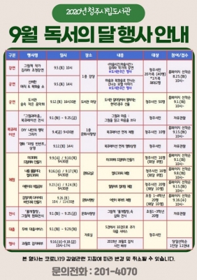 [충청뉴스큐] 청주시립도서관이 9월 독서의 달을 맞아 지역 주민들에게 독서의 즐거움을 알리고자 다양한 독서 문화공연 및 체험행사를 운영한다.