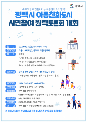 [충청뉴스큐] 평택시는 오는 9월 19일 ‘우리가 함께 만들어가는 아동친화도시 평택’이라는 주제로 아동 등 시민 의견수렴을 위한 원탁토론회를 개최한다고 밝혔다.