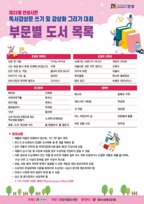 [충청뉴스큐]안성시는 지역민을 대상으로 개최하는 제22회 안성시민 독서 감상문 쓰기 및 감상화 그리기 대회 참가자를 오는 9월 1일부터 18일까지 모집한다.