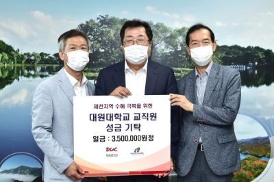 임재동 교학처장과 권영일 사무처장은 지난 25일 시청 시장실을 찾아 수재민들을 위해 써달라며 이상천 제천시장에게 지원금 350만원을 전달했다.