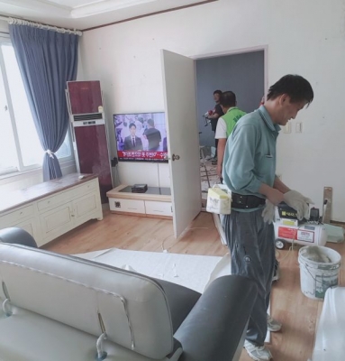 이들은 내려쬐는 뙤약볕 속에 구슬땀을 흘려가며 벽과 바닥에 침수가 남기고 간 흔적들을 모두 거둬내고 그 위에 새로운 장판과 도배 그리고 전기기설 교체로 말끔하게 채워줬다.