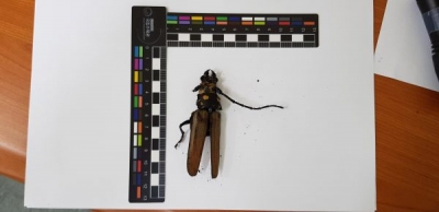이번에 발견된 장수하늘소 성충은 조류에 의한 공격으로 몸통의 일부가 파손된 상태였다.