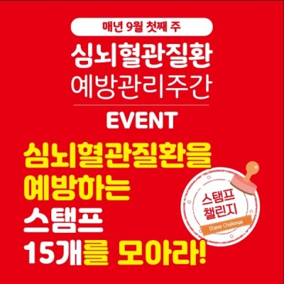 심뇌혈관 예방수칙을 스탬프 형식으로 15개 적립 시 선물을 제공하는 것으로 기간은 9월 1일부터 7일까지이며 목표 스탬프는 15개이다.