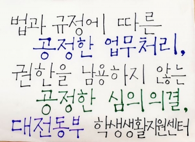 심의위원들은 ‘청백리 청렴정신으로 감동을 주는 대전동부 학생생활지원센터’라는 캐치프레이즈에 맞게 청렴 마인드 제고를 위한 다짐의 시간을 가졌다.