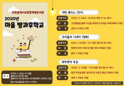 [충청뉴스큐] 인천시교육청계양도서관은 코로나19로 지친 학생들을 위로하고 재충전의 기회를 제공하고자 ‘2020년 마을 방과후학교’를 오는 9월부터 12월까지 운영한다고 밝혔다.