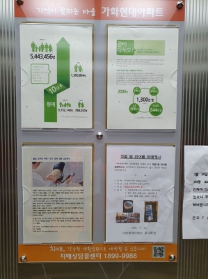 센터에서는 치매안심아파트 2개소 각 동별 엘리베이터 내에 건강게시판을 통해 치매에 대한 올바른 지식 및 치매를 예방할 수 있는 생활습관 등을 전달하며 주민홍보가 필요한 보건사업도 게시할 계획이라고 전했다.