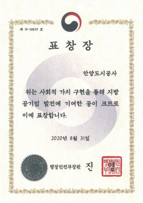 [충청뉴스큐] 안양도시공사는 지방공기업 발전 유공기관으로 선정돼 행정안전부 장관표창을 수상했다고 밝혔다.