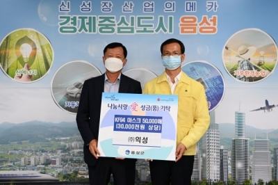 [충청뉴스큐] 음성군 삼성면 소재 국내 자동차용 내장소재 및 건축용 흡음, 차음, 제진 등의 첨단 기술을 개발하는 익성에서 31일 음성군청을 방문해 최근 재확산되고 있는 코로나19의 지역사회 전파를 막기 위해 써달라며 KF94 마스크 5만매를 기탁했다.