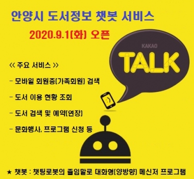 [충청뉴스큐] 안양시가 오는 9월 1일부터 석수도서관을 비롯한 10개 공공도서관에 대해 모바일 메신저를 기반으로 한 도서정보 챗봇 서비스를 시행한다고 31일 밝혔다.