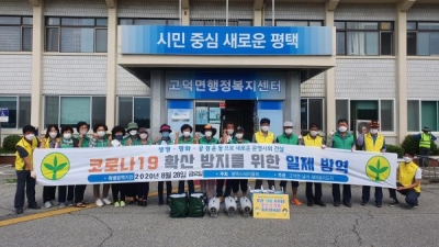윤민원 고덕면장은 “무더운 날씨에도 코로나19 재확산 방지를 위해 자발적으로 생활 방역 봉사를 해주시는 새마을남녀지도자회원들께 감사의 인사를 전하고 코로나19 재확산 방지를 위해 최선을 다하겠다”고 말했다.