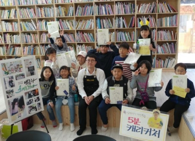 캐리커처, 미내액자그림, 부채그림 그리고 종이컵과 명함을 활용한 홍보물 제작이 백 작가의 문예창작 봉사활동이다.