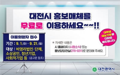 대전시는 시내에 주된 사무소를 두고 있는 기업과 단체를 대상으로 홍보매체 이용신청을 접수한 뒤 홍보매체운영위원회의 심의를 거쳐 10월 중 지원 대상을 최종 선정할 예정이다.