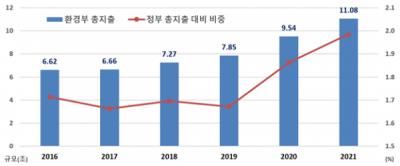 위와 같이 그린뉴딜 이행과 물 안전에 집중한 2021년도 환경부 총 지출은 전년도 대비 16.1% 증액된 11조 777억원이다.