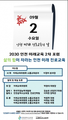 [충청뉴스큐] 인천광역시교육청은 오는 2일 인천광역시 미래교육위원회 ‘2030 인천미래교육 2차 포럼’을 개최한다고 밝혔다.