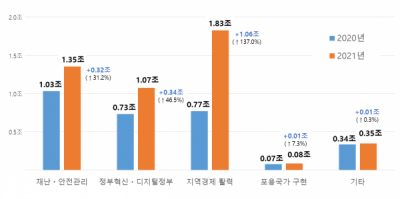 내년도 사업비는 올해보다 1조 7천억원이 증가한 4조 6,844억원으로 예방적 재난·안전관리, 지역활력 제고 정부혁신·디지털 정부, 포용국가 분야에 중점 편성됐다.