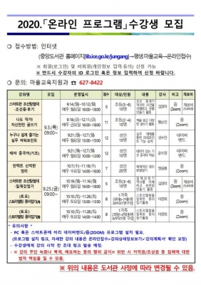 개설 강좌로는 초등학생 3~6학년 대상 ‘스마트한 조선탐험대-조선중·후기’, ‘스마트한 조선탐험대-일제강점기’, 초등학생 2~4학년 대상 ‘나도 작가 자신만만 글쓰기’, 성인 대상 ‘누구나 쉽게 즐기는 실무 파워포인트’, ‘테마 중국어’, ‘언택트 신박한 정리’, 유아 또는 초등학생 1~2학년 자녀와 부모가 함께 참여하는 ‘스토리텔링 종이접기’, ‘스토리텔링 종이접기’ 등 총 8개 프로그램을 운영할 예정이다.