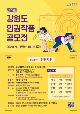 [충청뉴스큐] 강원도는 인권존중 문화를 확산하고 인권의식 향상을 위해 지난 9월 1일부터 오는 10월 16일까지 ‘제4회 강원도 인권작품 공모전’을 개최한다.