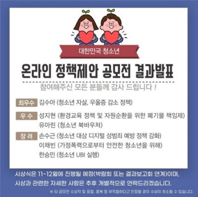 시상식은 11~12월에 열리는 대한민국 청소년박람회에서 진행될 예정이다.