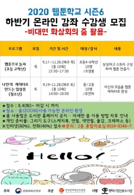 [충청뉴스큐] 평택시립안중도서관은 문화체육관광부가 주최하고 한국만화영상진흥원이 주관하는 2020년 웹툰창작체험관 ‘웹툰학교 시즌6’ 하반기 프로그램을 온라인 강좌로 운영할 예정이다.