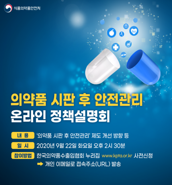 [충청뉴스큐] 식품의약품안전처는 오는 22일 의약품 제조·수입업체 안전관리 업무담당자 등을 대상으로 ‘의약품 시판 후 안전관리 온라인 정책 설명회’를 개최한다.
