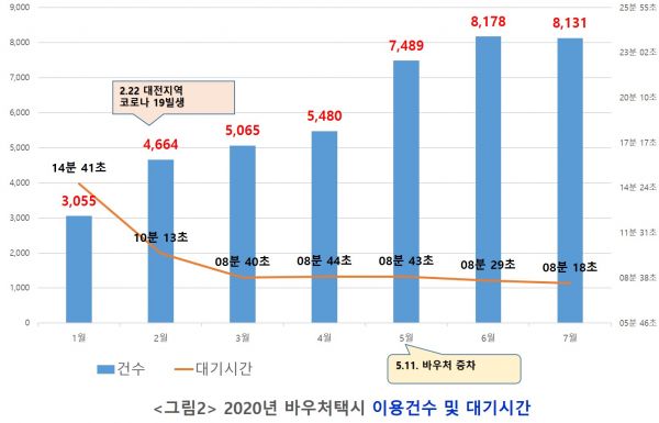바우처 및 전용임차 이용건수는 코로나19의 지역발생기간 동안 감소 또한, 바우처택시 증차 이후 기존에 운영 중인 전용임차택시의 대기시간도 8분이 줄어든 평균 13분대로 감소했으며 바우처택시의 대기시간은 평균 8분대로 실질적인 효과를 보이는 것으로 분석됐다.