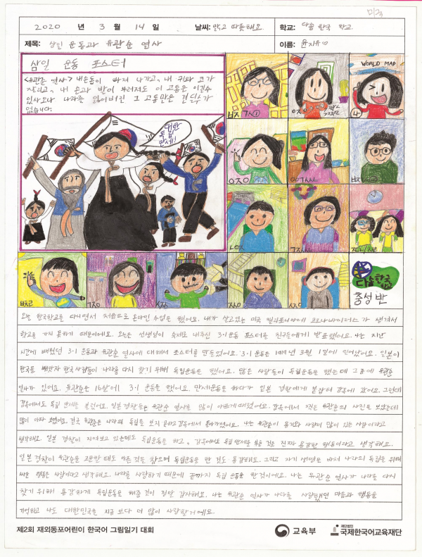 한국 역사·문화에 대한 높은 이해도뿐 아니라 온라인 수업이 진행되는 화면을 그림으로 잘 표현해 그림일기로서 진정성과 완성도가 높았다.