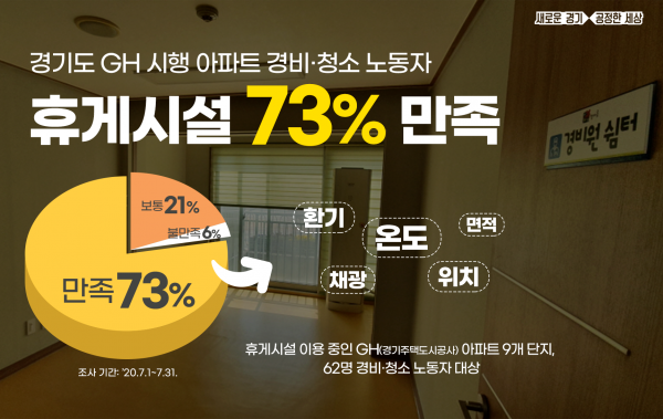[충청뉴스큐] 경기도가 경기주택도시공사에서 시행·관리하는 아파트에 경비·청소노동자 휴게시설을 의무 설치토록 한 가운데 휴게시설을 이용 중인 노동자의 73%가 만족한다는 조사결과가 나왔다.