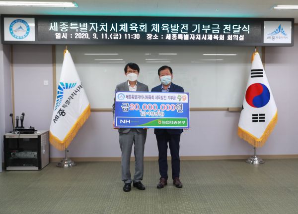 이날 이범구 NH농협은행 세종영업본부장은 체육발전 기부금 2,000만원을 정태봉 세종시체육회장에게 전달했다.
