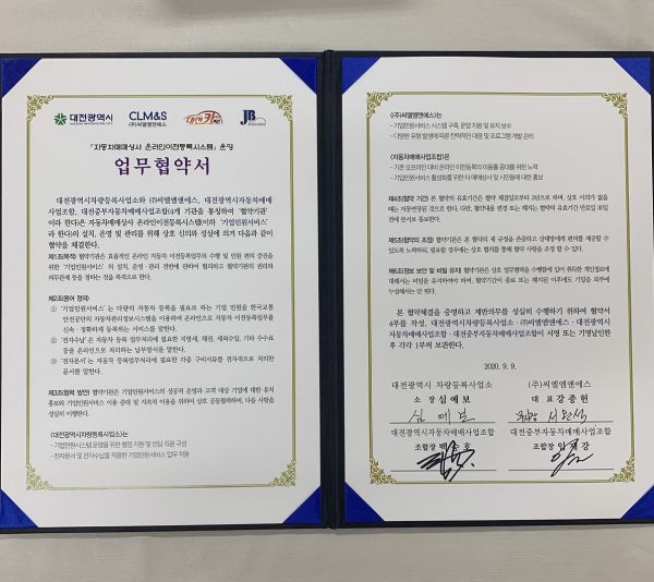 대전시는 이 시스템의 전면 도입 시행에 앞서 지난해 10월 23일 대전오토월드자동차매매사업조합, ㈜씨엘엠앤에스와 업무협약을 체결하고 시범운영을 진행해왔다.