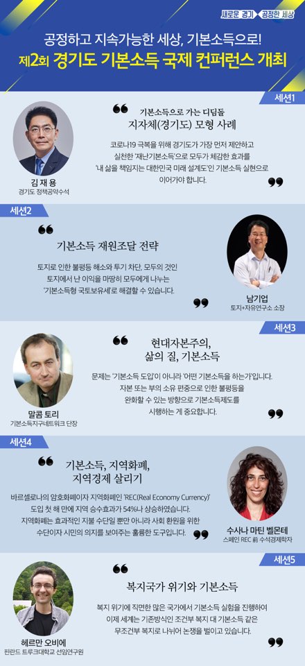이날 컨퍼런스는 기본소득으로 가는 디딤돌: 지방정부 모형 사례 기본소득 재원조달 전략 현대자본주의, 삶의 질, 기본소득 기본소득, 지역화폐, 지역경제 살리기 복지국가 위기와 기본소득 5개 세션에 걸쳐 진행됐으며 선별소득보장과 기본소득의 효과 비교분석, 지역화폐의 지역경제 살리기 효과 등 기본소득에 대한 다양한 정보 공유와 논의를 진행했다.