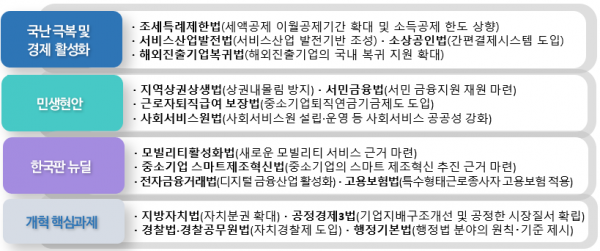이를 위해 정부는 ‘조세특례제한법’, ‘중소기업 스마트제조혁신 지원에 관한 법률’, ‘고용보험법’ 및 ‘행정기본법’ 등 경제 활성화와 민생현안 관련 주요 법안이 정기국회 내 원활히 처리될 수 있도록 범정부적인 입법역량을 집중할 계획이라고 전했다.
