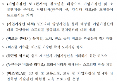 둘째날에는 쉽고 재미있게 기업가정신을 이해하기 위한 ‘골든벨 퀴즈쇼’, 지속가능한 발전목표 달성을 위한 청소년의 아이디어를 주제로 ‘스피치 대회’, ‘우수 창업동아리 경진대회’ 등이 개최될 예정이며, 마지막날에는 비즈쿨 학생들의 뮤지컬, 댄스 등 장기자랑 대회인 ‘비즈쿨 뽐내기’, ‘비즈쿨 가수왕’ 등을 개최한다.