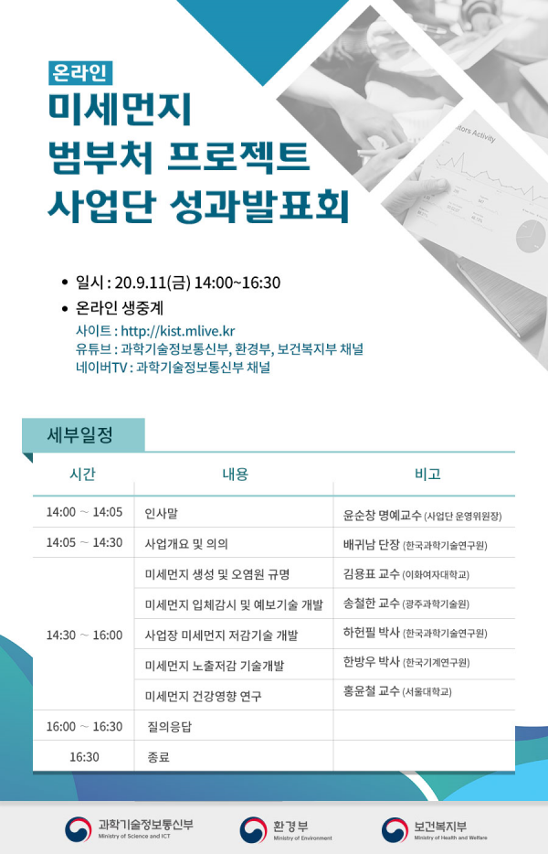 [충청뉴스큐] 과학기술정보통신부, 환경부, 보건복지부는 미세먼지 범부처 프로젝트 사업 ‘성과발표회’를 오는 11일 온라인으로 개최한다고 밝혔다.