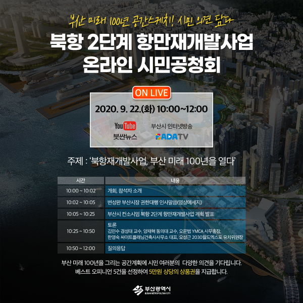 한편 온라인 시민공청회는 오는 22일 오전 10시부터 ‘북항재개발사업, 부산 미래 100년을 열다’라는 주제로 부산시 공식 유튜브채널 ‘붓싼뉴스’에서 비대면으로 개최될 예정이다.
