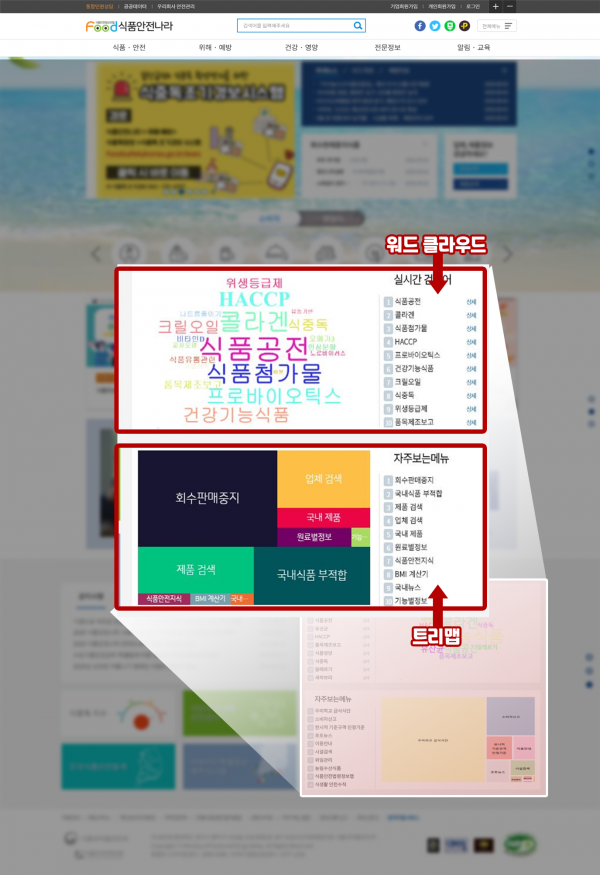 이번 ‘시각화서비스’는 식품안전나라에서 많이 찾는 핵심 검색어와 메뉴의 빈도수를 크기로 표현하는 워드 클라우드와 트리맵을 제공하고 있으며 많이 노출되는 단어와 메뉴가 크기로 표시되기 때문에 관심 정보를 한눈에 파악할 수 있다는 장점이 있다.
