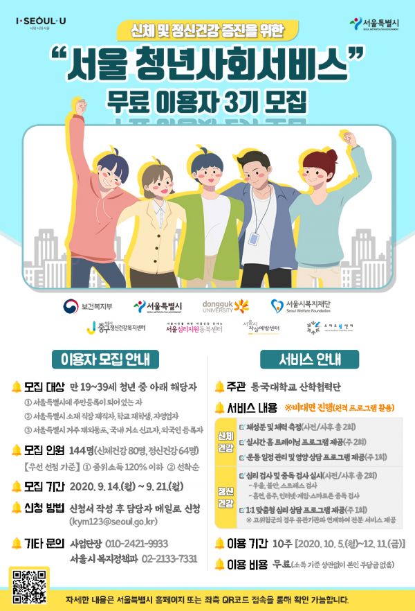 [충청뉴스큐] 서울시는 ‘서울 청년사회서비스사업단’에서 제공하는 신체 및 정신건강 증진 서비스를 10주 간 무료로 이용할 청년들을 14일부터 모집한다.