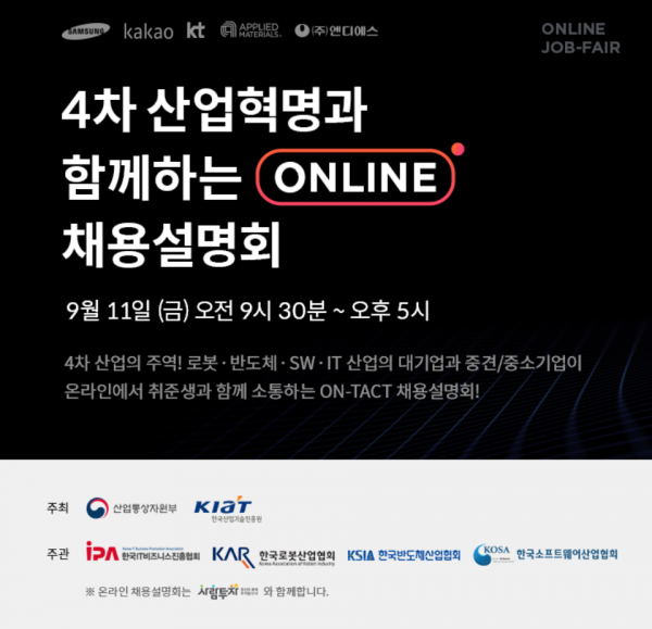 9월 11일 10시부터 IT비즈니스, 로봇, 반도체, 소프트웨어 4개 분야의 대기업과 중소·중견기업이 함께 참여하는 “4차 산업혁명과 함께하는 온라인 기업 채용 설명회”가 비대면 방식으로 개최된다.
