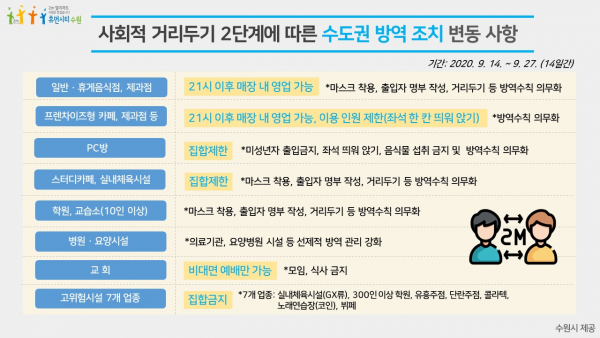 수원시 관내 복지관, 경로당, 주민자치센터, 도서관, 미술관, 박물관 등은 9월 27일 24시까지 휴관하고 실내외 공공 체육시설은 별도 통보가 있을 때까지 운영을 중단한다.