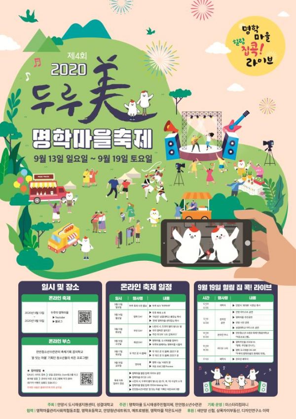 최대호 안양시장은 “코로나-19로 인해 비대면 온라인 축제로 개최되지만 새로운 방법을 시도해보는 기회라고 생각되며 오늘 축제를 통해 명학마을 주민과 안양시민이 힐링 할 수 있는 뜻깊은 자리가 될 수 있기를 기대한다”고 했다.