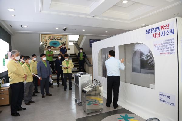 [충청뉴스큐] 금산군은 지난 14일 청사 현관 입구에 집단감염 차단 시스템으로 공간멸균기와 클린존을 설치하고 운영에 들어갔다.