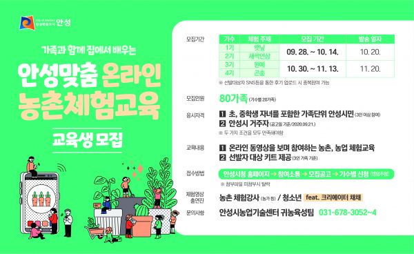 [충청뉴스큐] 안성시농업기술센터는 오는 28일부터 “집에서도 즐기는 온라인 농촌체험교육”에 참여할 가족을 모집한다.