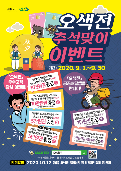 이벤트 당첨자 발표는 오는 10월 12일 오산시 지역화폐 ‘오색전’ 홈페이지를 통해 발표된다.