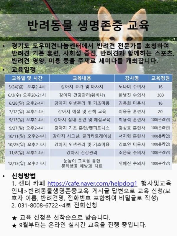 [충청뉴스큐] 경기도는 지난 13일 경기도 도우미견나눔센터에서 진행한 올해 첫 ‘온라인 반려동물생명존중교육’이 성황리에 진행됐다고 밝혔다.